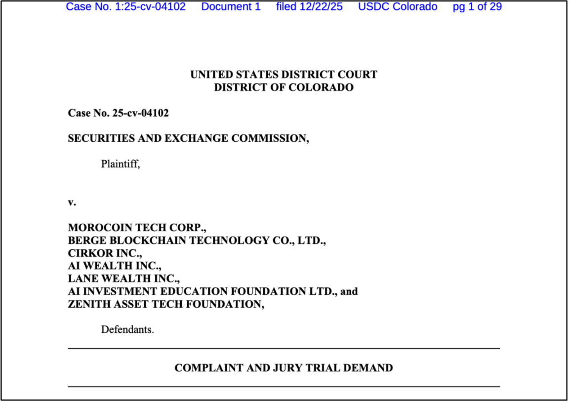 2025 年 12 月 22 日,美国证券交易委员会(SEC)在加密货币监管领域展开重拳出击,对 Morocoin Tech Corp.、Berge Blockchain Technology Co. Ltd.等所谓的加密交易平台及 AI Wealth Inc.、Lane Wealth Inc.等投资俱乐部提起诉讼,指控其通过社交媒体实施虚假交易和虚假发行,从散户投资者手中非法挪用约 1400 万美元资金。目前,SEC 已向法院要求对被告处以永久禁令、民事处罚及返还非法所得,并警示投资者切勿轻易依赖群聊信息做出投资决策。此次执法行动揭示了加密市场中存在的欺诈风险,也反映了 SEC 对加密领域的监管态度正日趋严格。本文将深入解构本案的关键细节,剖析 SEC 的执法依据与监管逻辑,探讨其对 Web3 金融生态的影响,为行业参与者提供合规参考。