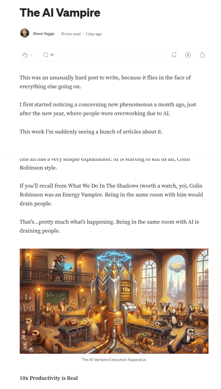 耶格指出,当生产力提升超过约 2 倍时,一种被他称为「吸血鬼效应」的现象便开始显现,技术不再仅仅是工具,而开始反向塑造使用者的工作节奏和心理状态。