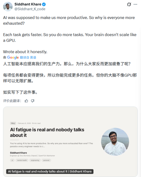 西丹特·卡雷(Siddhant Khare)是一位在博客中详细记录这一过程的软件工程师。他在《AI 疲劳是真实存在的》一文中写道,自己上一个季度的代码交付量达到职业生涯峰值,但精神上的疲惫同样被拉满。