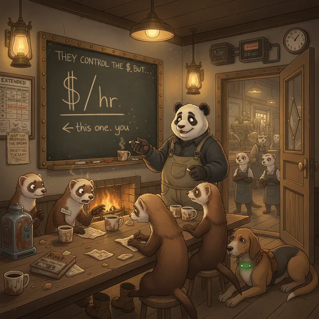 耶格回忆了 2001 年在亚马逊工作的经历。当时他所在的团队承受着高强度的交付压力,而回报高度不确定。他在一次讨论中向同事写下公式:$/ 小时。他解释道,分子(年度固定薪酬)在短期内难以改变,但分母(实际工时)具有相当大的弹性空间。