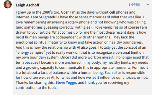 LinkedIn 用户利赫·阿绍夫(Leigh Aschoff)将问题引向了更深层。他认为,当代人与 AI 的互动方式,映射出人际互动中长期存在的边界识别障碍。许多人在与他人的关系中缺乏识别和表达自身极限的能力,而这种能力的缺失被平移到人机关系中。工具不会主动停止,也不具备感知使用者疲劳的能力。