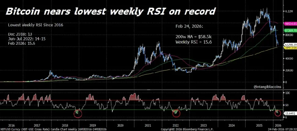 Thorn 表示,周线 RSI 值低于他所说的最黑暗的熊市阶段之外的任何时期。