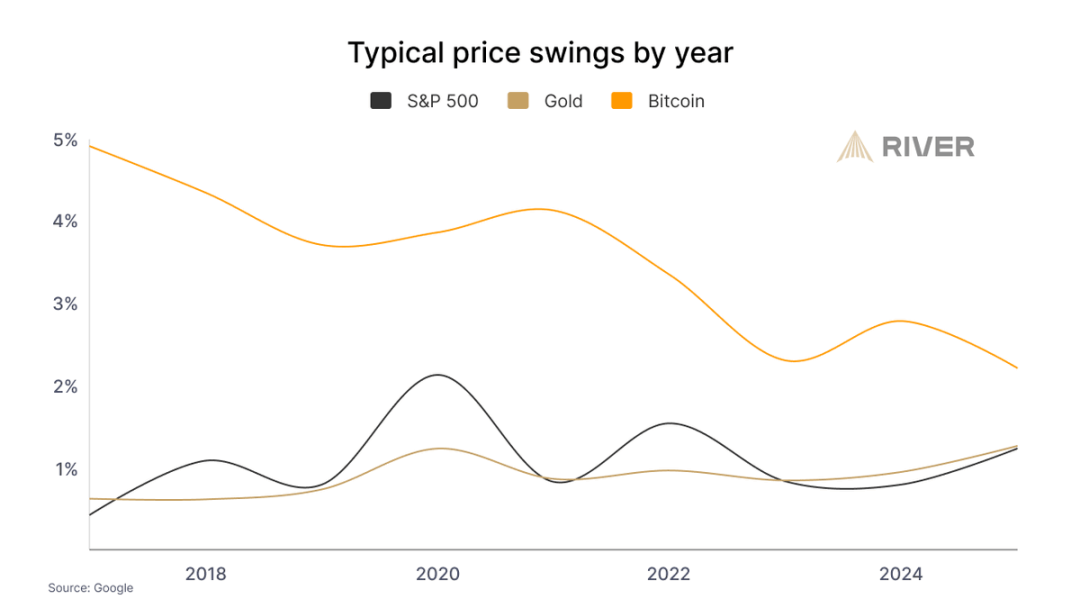 比特币延续了长达十年的波动率下降趋势,正在接近黄金与标普 500 的水平。