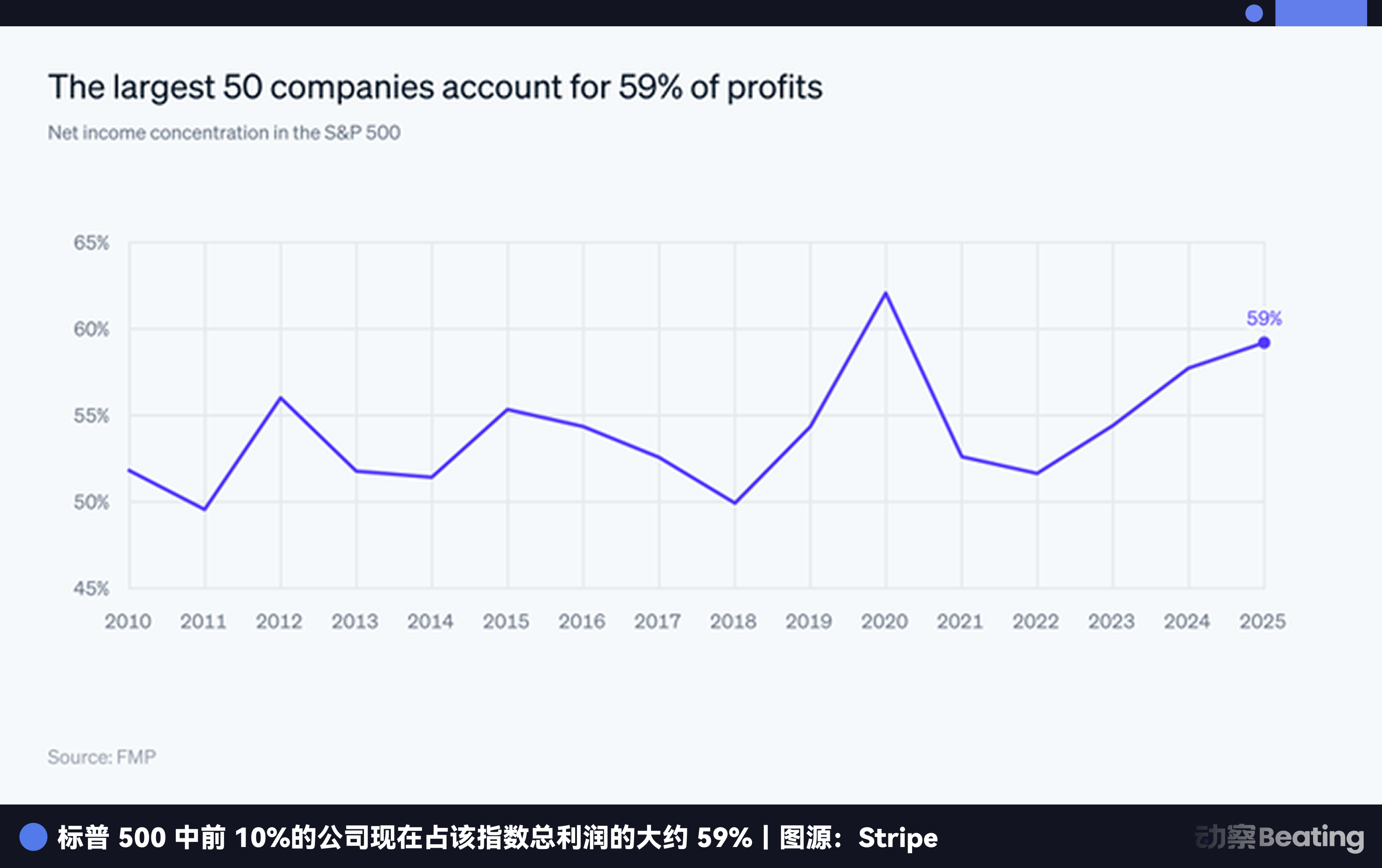 Stripe 在信中引用了一组数据:美国盈利能力最强的 1/3 上市公司,拿走了整个股市 2/3 的市值,这是自 1963 年有数据以来的最高比重。