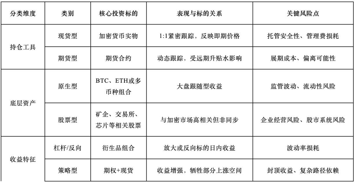 加密相关场内产品除按持仓工具分为现货持有型与期货合约型外,还可按跟踪对象分为单资产型与指数或篮子型;按底层资产类别区分为加密资产型与产业链股票主题型。杠杆、反向与部分策略型属于收益目标与再平衡机制更复杂的产品机制,常见为按日重置,路径依赖更强,适用人群更窄。
