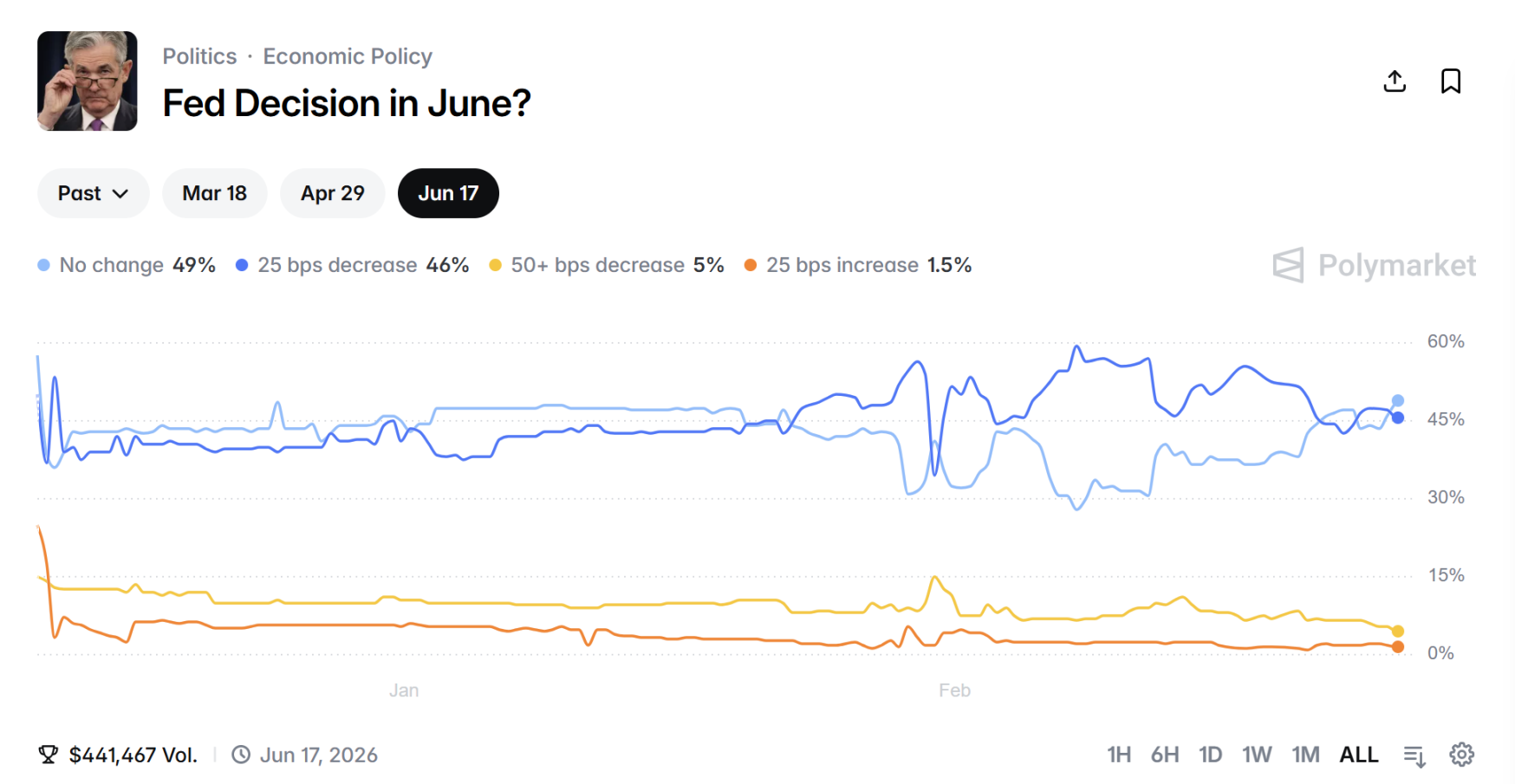 根据 Polymarket 最新数据显示,今年 3 月,美联储不降息的概率为 97%,今年 4 月,不降息的概率为 86%,今年 6 月,美联储降息 25 个基点为 46%。
