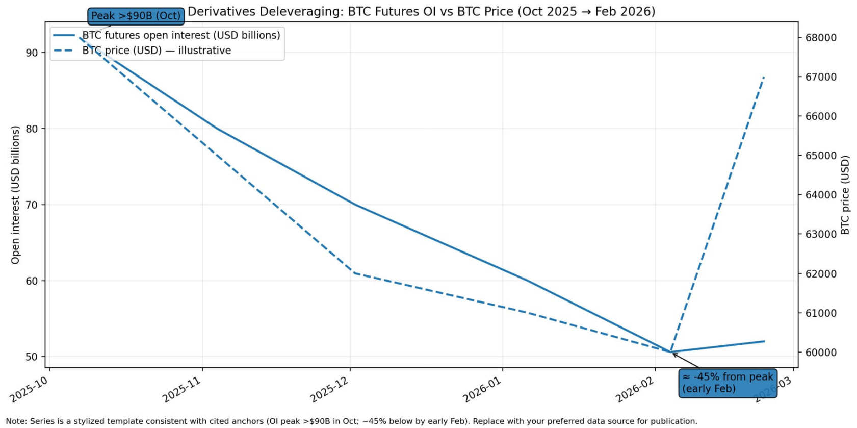 比特币期货未平仓合约从 2025 年 10 月超过 900 亿美元的峰值下降了约 45%,降至 2026 年 2 月初的水平,与此同时,比特币价格从约 68,000 美元跌至接近 60,000 美元,随后反弹至 67,000 美元左右。