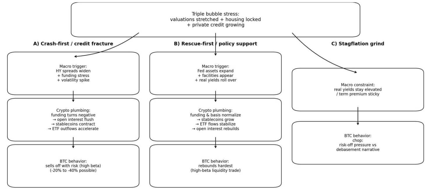 一张流程图展示了在三重泡沫压力下比特币的三种潜在路径:信贷破裂导致 20% 至 40% 的抛售,政策救助引发高 beta 反弹,或者滞胀导致价格在避险压力与货币贬值叙事之间波动。