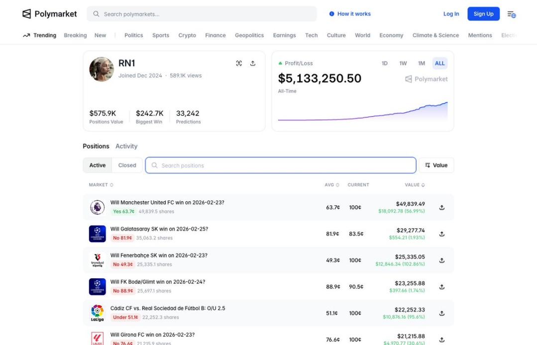 RN1 的 Polymarket 主页:polymarket.com/profile/RN1