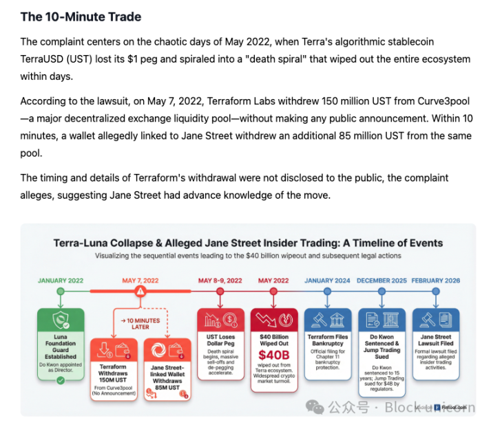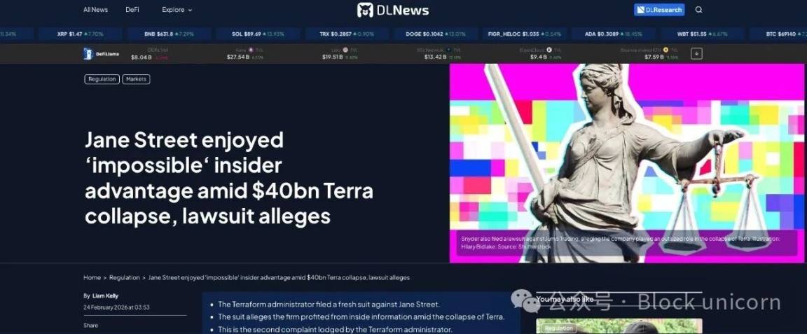 而本周,Terraform Labs 的破产管理人向曼哈顿联邦法院提起诉讼,指控 Jane Street 利用内幕消息提前操纵了 Terra Luna 在 2022 年 5 月的崩盘。这场崩盘导致 400 亿美元的市值蒸发,并引发连锁反应,最终导致 Celsius、Three Arrows Capital 和 FTX 等公司倒闭。