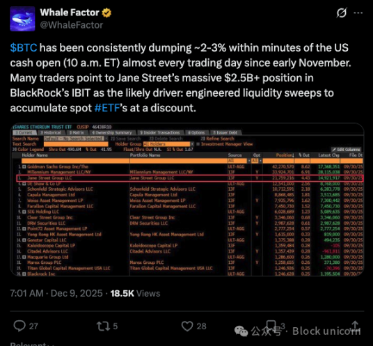 矛头直指 Jane Street,而且理由充分。Jane Street 是贝莱德旗下 IBIT(全球最大的现货比特币 ETF)仅有的四家授权参与者之一。其他三家分别是 Virtu Americas、摩根大通证券和 Marex。作为授权参与者,Jane Street 拥有创建和赎回 ETF 份额的独特权限,这意味着他们直接参与了比特币在机构投资者之间的流动。