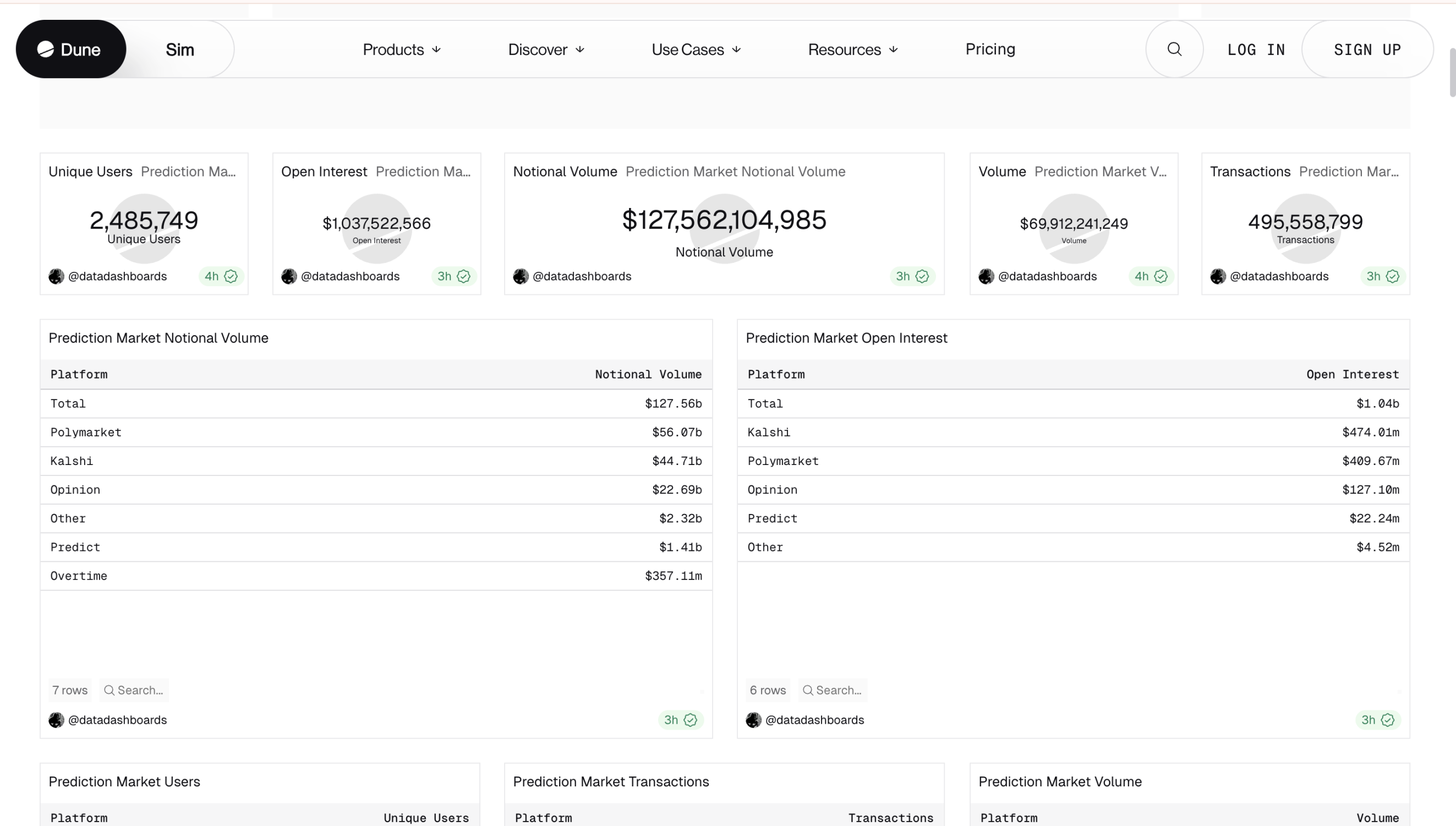 截至 2026 年 2 月,预测市场全行业 Notional Volume 总计 $1275 亿,实际 Volume $699 亿,独立用户数 249 万,未平仓合约突破 $10 亿。