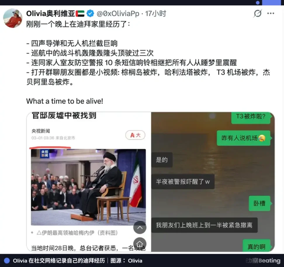 有人开始撤离。Mason 所在的一些迪拜本地人群里,有做导游的聊到 VIP 客户要走,但阿曼边境已经堵死了,平时办签证就要排长队,现在更别想。有人问他要不要也撤,他心里算了笔账:去沙特 1000 多公里,去阿曼几百公里。「现在去阿曼说不定更危险,这一路上不知道会遇到什么。」