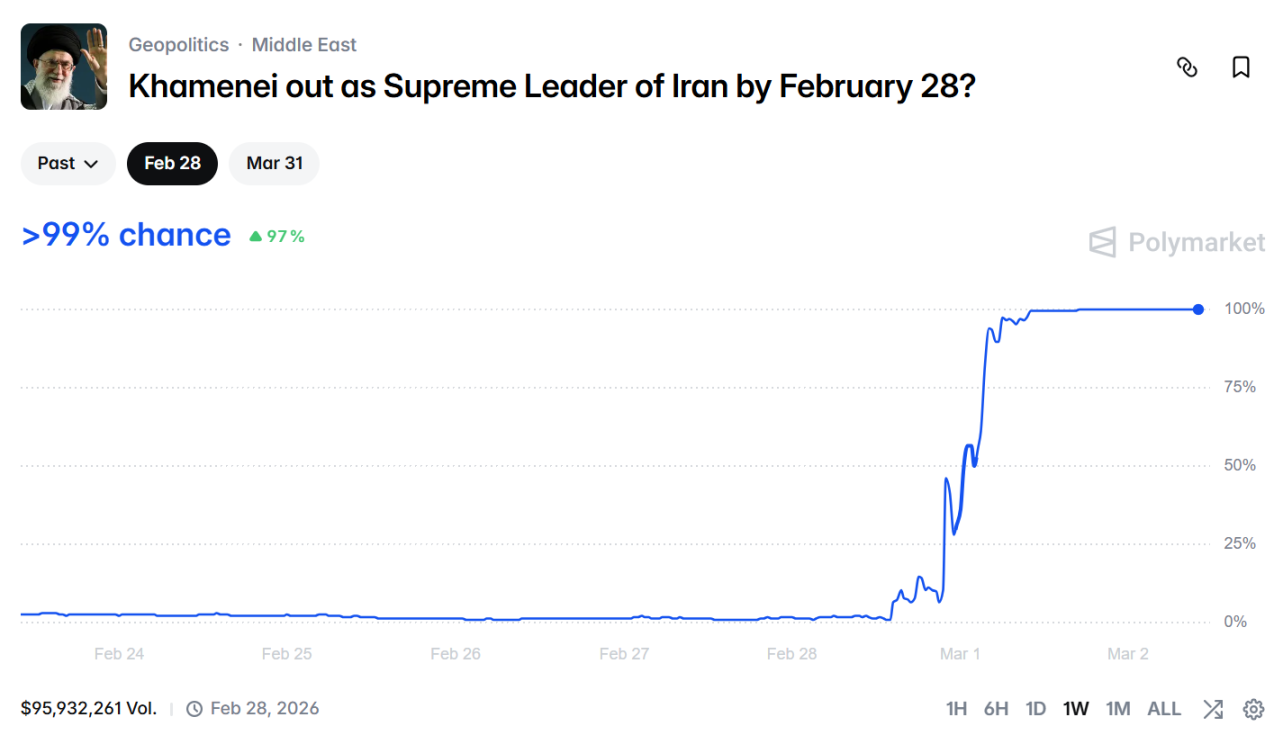 2 月 28 日,美国和以色列联合对伊朗发动空袭,导致伊朗最高领袖阿里·哈梅内伊丧生。这场袭击震动了中东地缘政治,在 21 世纪的今天,战火仍在四处蔓延,其战争影响也在加密世界的预测市场上掀起巨浪。