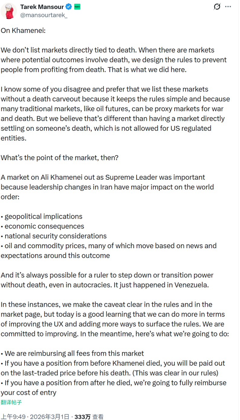 袭击后,Kalshi 暂停了市场,CEO Tarek Mansour 在 X 上发帖解释:他们反对从个人死亡中获利,所以会按死亡前最后一笔交易价结算,并全额退还所有手续费。Mansour 强调,这是为了“道德底线”,避免平台变成“死亡赌局”。一些用户抱怨这像临时改规则,但 Kalshi 坚持这是预设条款,只是在袭击前一天澄清了细节。