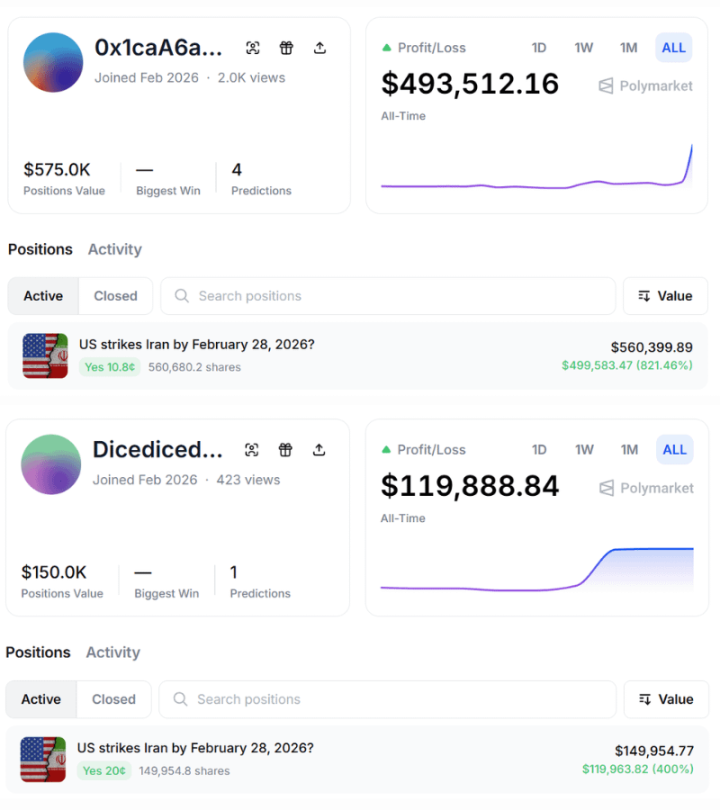 这 6 个钱包均于 今年 2 月新建,几乎全部交易集中在预测美军袭击时间的合约上,部分仓位在德黑兰首次传出爆炸消息前数小时建仓,合约买入价格低至约 0.10 美元。分析人士称,此类在重大地缘政治事件前的集中押注行为,特征上类似此前预测市场中的「疑似内幕交易」。