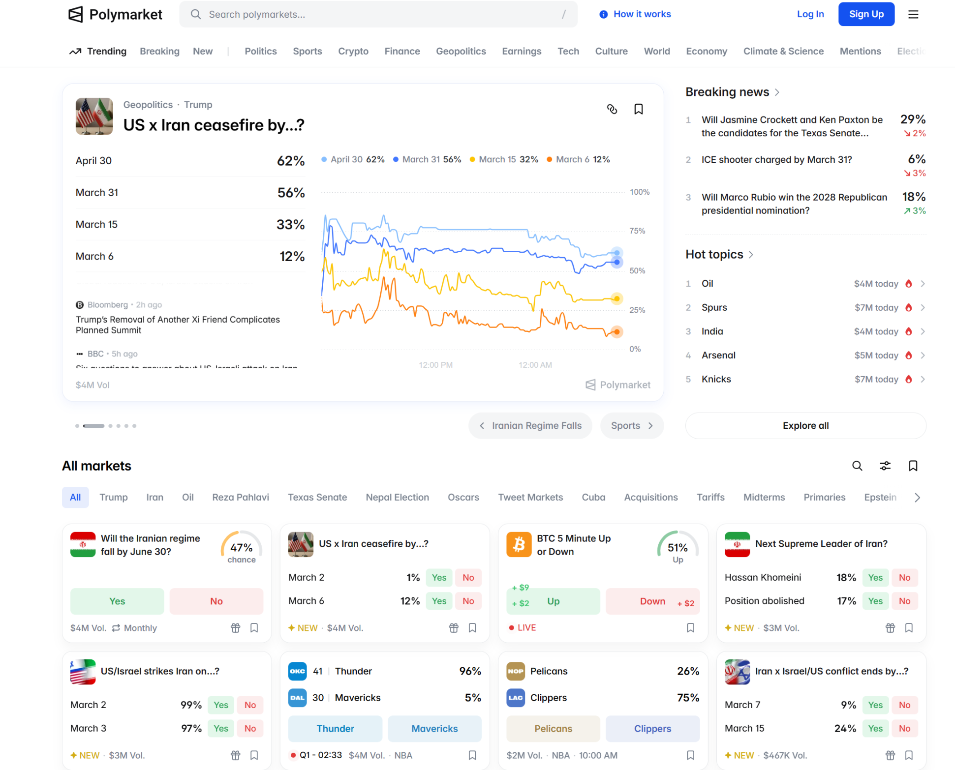 当然,不是所有人都赢。许多人押错日期,损失惨重。目前,Polymarket 已更新其网站顶部展示,将有关伊朗局势的预测市场均置顶。