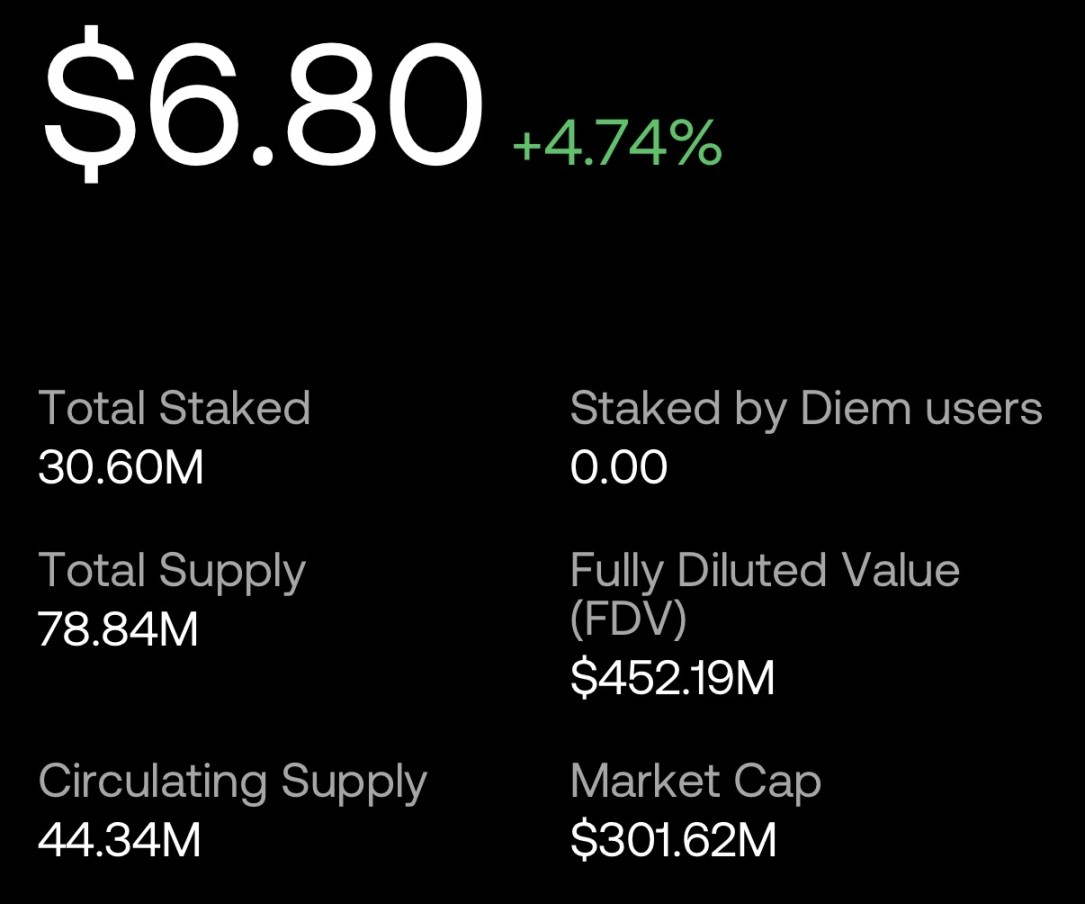 与按次付费的传统 API 不同,Venice 引入「Diem」作为统一计算单位,1 Diem 相当于价值 1 美元的 AI 推理资源。用户或 AI 代理通过质押 VVV,可获得相应比例的 API 调用额度,且无需为每次请求付费。若质押 1% 的流通代币,即可永久占用 Venice API 总容量的 1%。