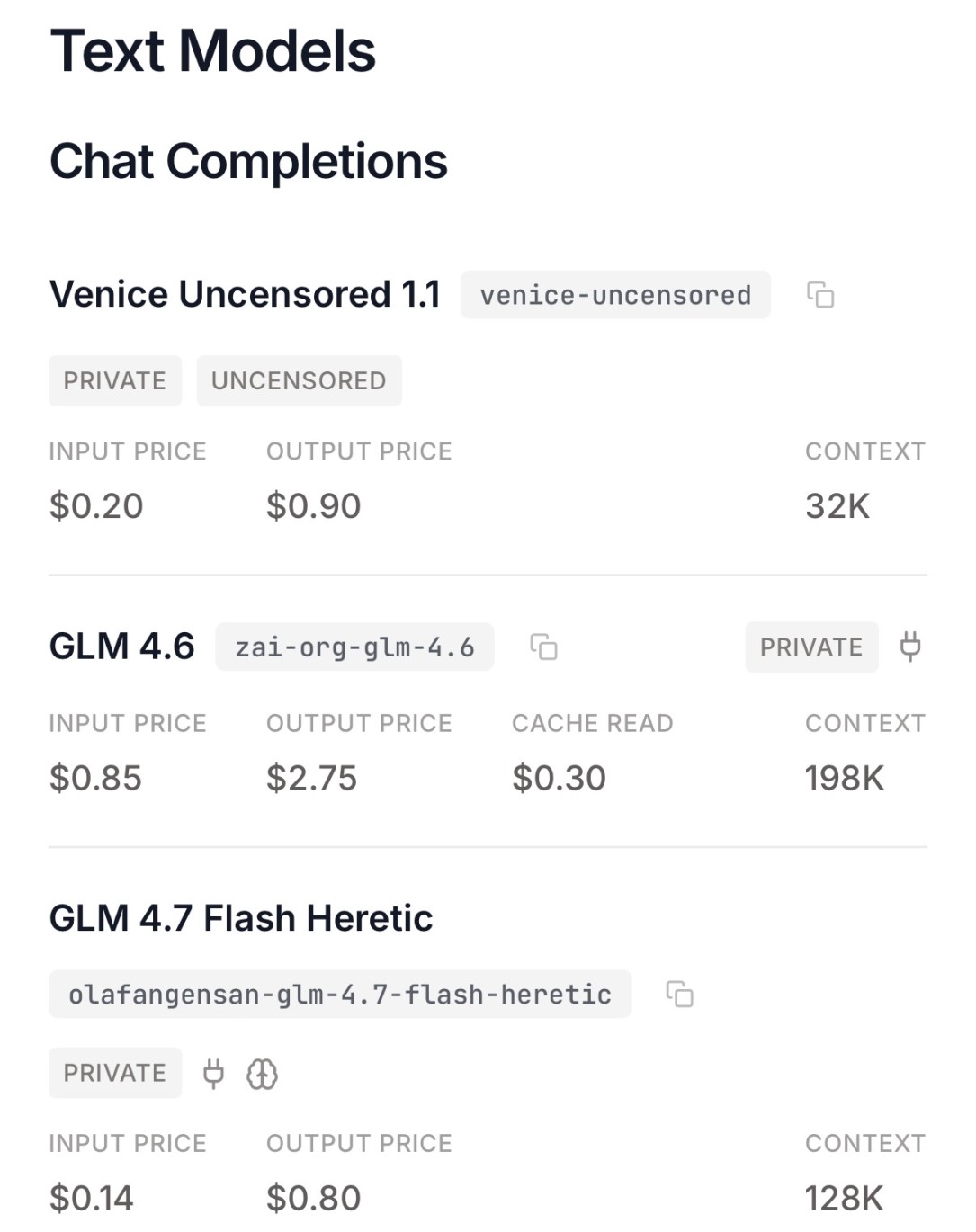 GLM 系列的两款模型也在 Venice 页面同时展示:GLM 4.6 定位中高端,输入 0.85 美元、输出 2.75 美元,提供 198K 超大上下文;GLM 4.7 Flash Heretic 则主打性价比,输入仅 0.14 美元,输出 0.80 美元,上下文窗口 128K。