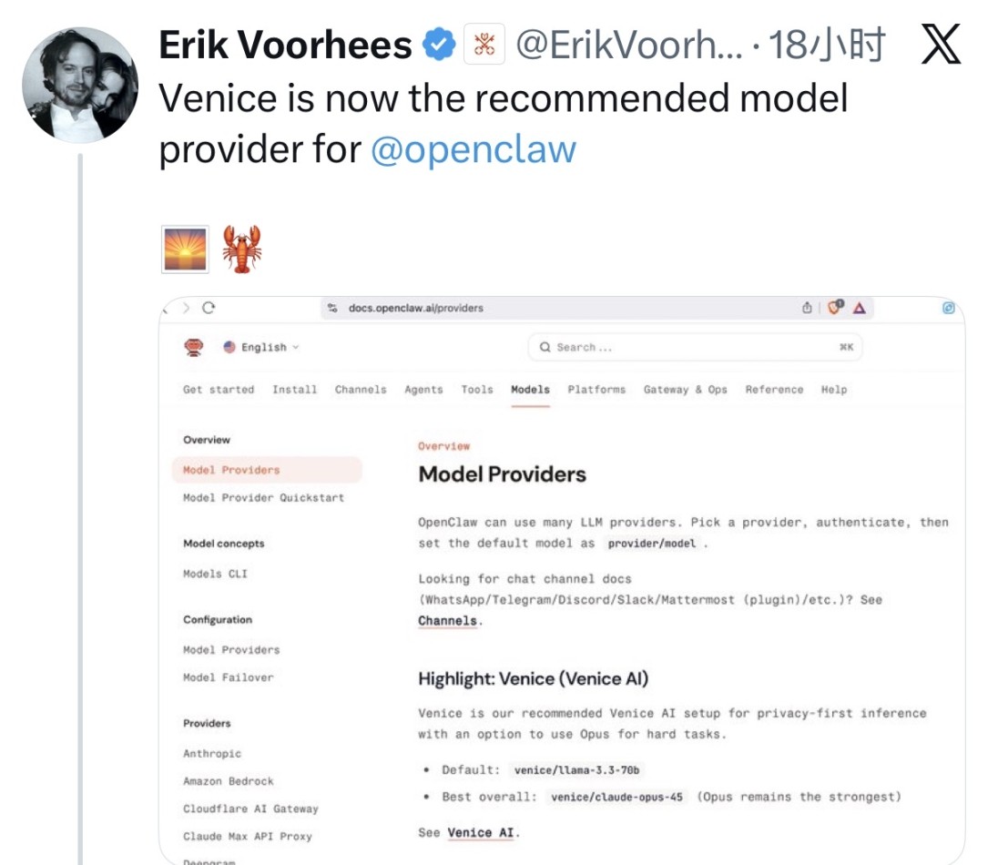 这一惊人涨势恰逢 Venice 在 AI 应用层面获得新的关注。3 月 2 日,Venice 创始人 Erik Voorhees 发布推文称,Venice 已成为新兴 AI 项目 OpenClaw 的推荐模型提供商。