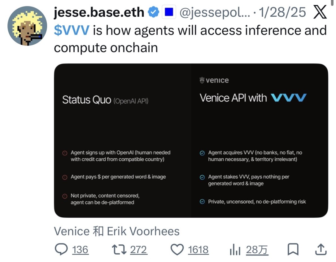 值得注意的是,Base 联合创始人 Jesse Pollak 曾在 2025 年 1 月发表过与 VVV 相关的推文,Jesse 表示「VVV 是 AI 代理在链上访问推理和计算的方式」。