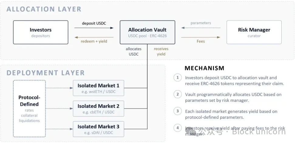 顶层是分配层,由风险管理者设定参数。金库接受单一的贷款资产(通常是 USDC),并将其部署到部署层的多个独立市场。