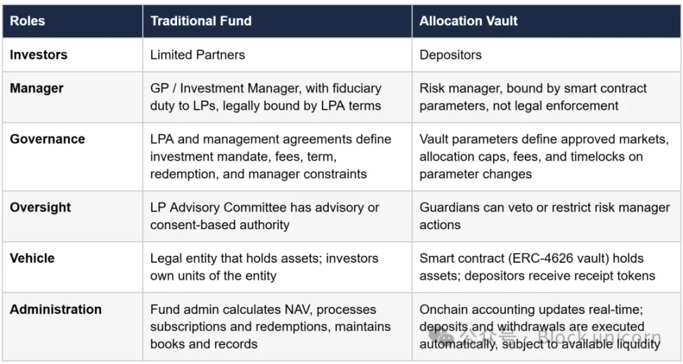 对于机构读者而言,更便于理解的方式是直接比较传统基金结构和资产配置库。下表列出了两者的角色,并重点介绍了执行机制的差异。