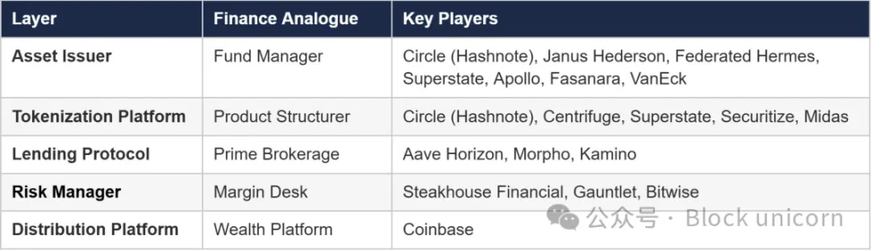 为什么投资管理者应该关注?资产配置库不仅仅是风险基础设施,它们还是分销渠道。链上版本的基金到投资者价值链包含五个层级:资产发行方、代币化平台、借贷协议、风险管理者和分销平台。当代币化产品被接受为抵押品时,它就接入了整个体系。