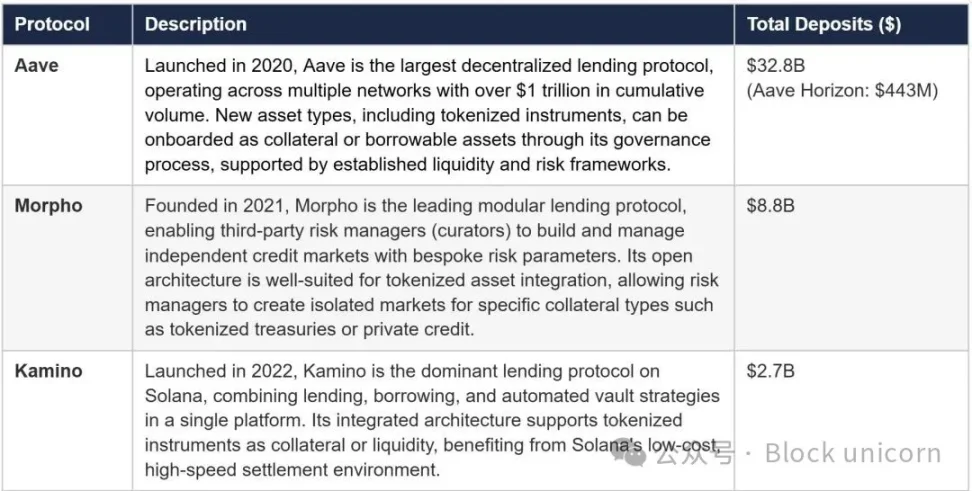 在代币化资产市场中最活跃的三个借贷协议是 Aave Horizon、Morpho 和 Kamino。每个协议的详细简介见图表 C。