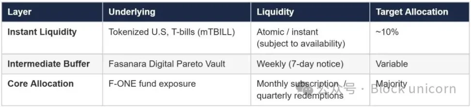 即时流动性套利是关键创新。该部分目标覆盖约 10% 的资产管理规模 (AUM),允许持有人立即将 mF-ONE 兑换为 USDC(取决于可用流动性),并收取赎回费以补偿剩余持有人的现金拖累。实际上,它将季度可赎回信用基金转化为可在实时结算市场运作的工具。