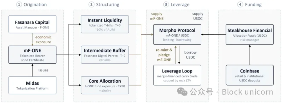 • 发起:合格投资者完成 Midas 的注册流程,存入 USDC,并获得 mF-ONE。mF-ONE 代表代币化的无记名债券凭证,可获得 Fasanara F-ONE 基金的经济敞口。