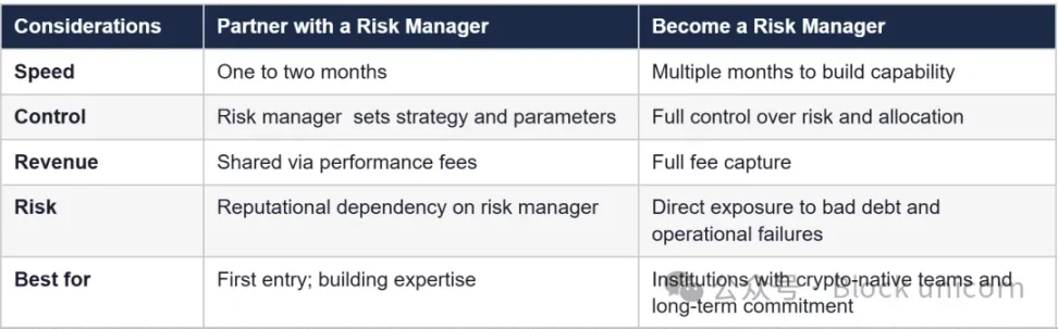 对于大多数机构而言,务实的做法是先作为合作伙伴积累经验,然后再评估自主管理的可能性。这与传统资产管理公司进入新市场的典型方式类似:先与外部管理者合作,学习其运作机制,然后在策略验证后将相关能力纳入公司内部。