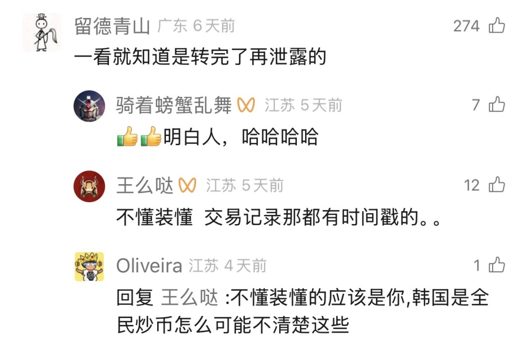 网友辣评:一看就知道是转完了,再泄露的。而且韩国「全民炒币」,应该清楚这些。