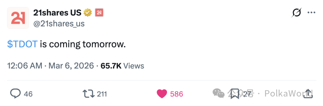重磅消息!资产管理公司 21Shares 宣布,Polkadot ETF $TDOT 即将在 Nasdaq 上市,并已公布招股说明书与产品页面!