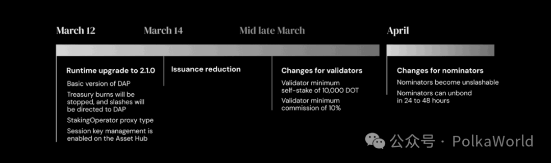 Parity 本周发布最新公告,宣布 Polkadot 将从 2026 年 3 月 12 日起,引入新的 DOT 发行模型、动态分配池(DAP);同时,还将对质押机制、预算分配方式以及网络安全机制进行调整。此外,Parity 还公布了时间线: