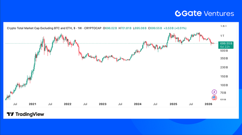 Total crypto market cap also stayed mostly flat last week, rising just 0.05%. However, market cap excluding BTC and ETH fell 0.4%, and the broader altcoin market weakened further, with market cap excluding the top 10 dropping 1.28%.