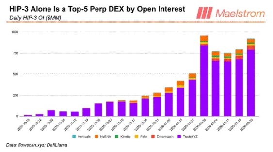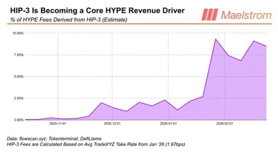 仅仅四个月,HIP-3 的交易量就贡献了 Hyperliquid 近 10% 的总收入。无许可上币一直是 DEX 的圣杯,交易量的快速增长证明,这是 Hyperliquid 甩开竞争对手的关键。