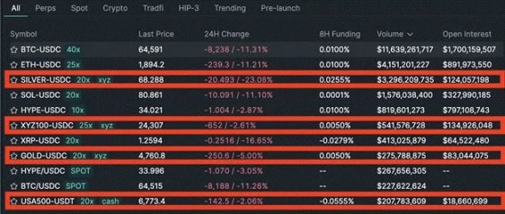 HIP-3 允许任何人无许可上线永续合约。只要质押 50 万枚 HYPE,你就可以用 Hyperliquid 的撮合与保证金引擎,创建任何你想要的交易市场。TradeXYZ 就是这么做的,它的旗舰产品是白银、黄金、纳斯达克 100、标普 500 的永续合约。