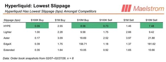 你可以看到,在 Hyperliquid 上大额交易,大多数时候成本最低。因此,即便竞争对手的显性手续费低 1–2 个基点,真正的大额交易者依然会涌向 Hyperliquid,因为他们可以更大规模交易,对市场冲击最小。