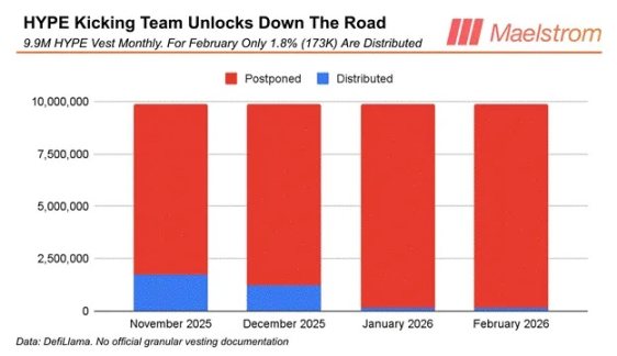 我们都痛苦地知道,除非你做空,否则比特币从去年 9 月 HYPE 跌到约 20 美元的局部低点。我认为 HYPE 重新上涨的催化剂是:团队代币释放量从 1 月的 991 万枚,骤降到区区 14 万枚。