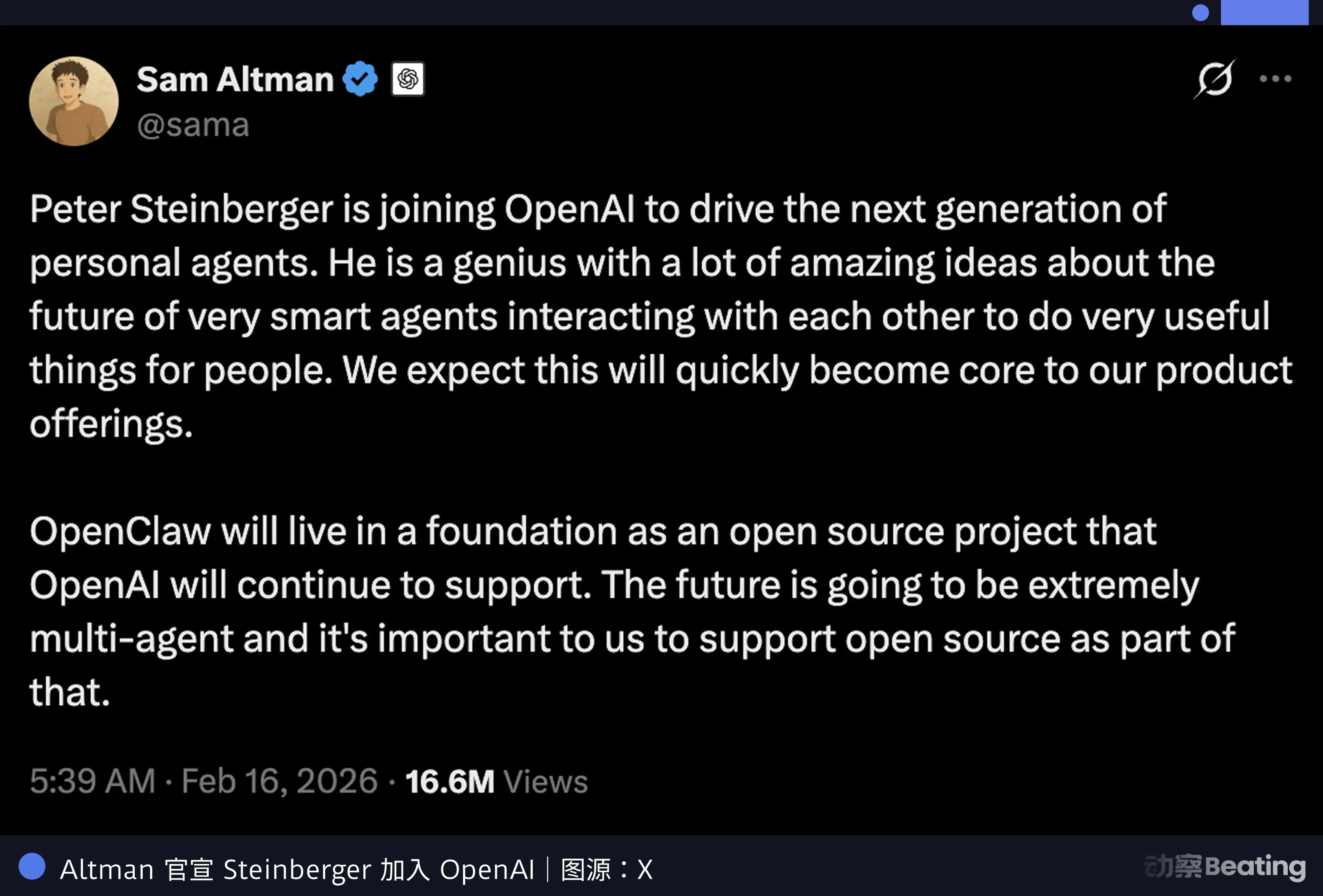 同期,在 Agent 生态这个具体赛道上,OpenAI 做了同样性质的操作,但拿到的是另一个人。