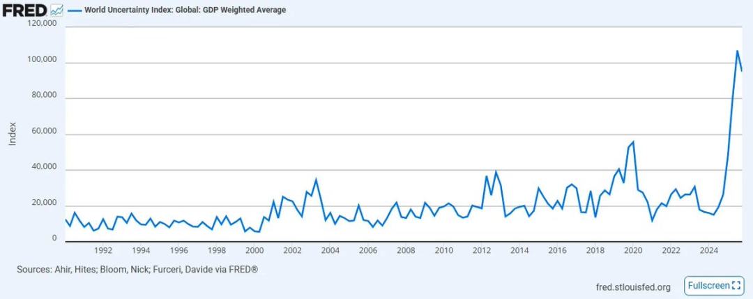 国际货币基金组织构建的全球不确定性指数(IMF)近期创下 2008 年创立以来的最高水平。政策与贸易领域缺乏明确的方向性和协同性,自此前历史高点以来,市场情绪已显著恶化,且这一趋势大概率还会进一步加剧 —— 尤其是在中东地区,原本摇摇欲坠的旧有全球联盟正被卷入一场前所未有的冲突。
