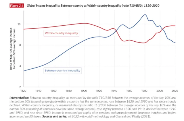 当看到「全球 10% 人口拥有 76% 的全球财富」这类头条新闻(数据来源:联合国 2022 年世界不平等报告)时,我们需要理解一个关键区别:这并非部分国家率先致富、而其他国家落后的故事,而是全球范围内每个国家内部都在发生的事:全球各地的贫富差距都在扩大,且在所有可衡量的时间维度上都在加速。