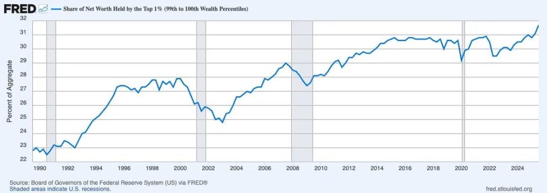 更准确地说,问题不止于收入不平等,而是财富不平等。在人类历史上,从未有过如此高比例的财富集中在最顶层 1% 人群手中。以美国为例,最顶层 1% 人群持有的净资产份额持续攀升,目前已接近全国总财富的三分之一。