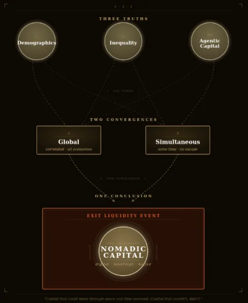你真正需要持有的,是游牧资本。 这种资本可在代际人口结构、政治边界和人工智能原生生态中自由迁移;能绕过货币的「霍尔木兹海峡」。在 21 世纪,游牧即数字化。具体的投资工具因人而异,激进投资理论 提供了一个可行框架:配置 60% 合规资产与 40% 抗风险资产。但如果你严格遵循上述三个条件审慎决策 —— 持有年轻人最终需要的资产、持有政府难以触及的资产、持有自主经济体系中实际可交易的资产 —— 结局便不再是预测,而是必然。不确定性终将化为定数。