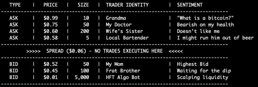 买单(bids)包含所有想买的人,卖单(asks)包含所有想卖的人。上图中,买卖单按从最优到最差的价格排列。最高买价和最低卖价之间的差距叫价差(spread)。