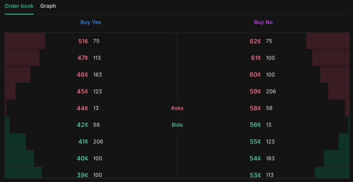 图注:Kalshi 真实订单簿界面,左侧为「是」、右侧为「否」