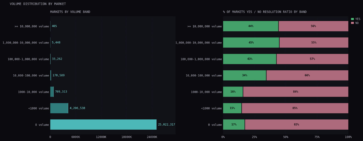 这说明,对于任何一个市场,基础概率应该偏向结算为「否」。交易量的影响也讲得通——包含大量子市场的事件,交易量会分散在各个子市场上,最终只有一个或少数几个结算为「是」。