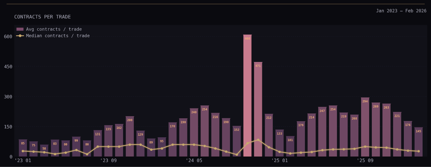 在这些市场中,平均每笔交易的合约数在 150-250 之间。2024 年出现过一次巨大的尖峰,因为美国大选中有人下了 100 万份合约的大单。中位数远低于平均值,大多数月份不到 50。