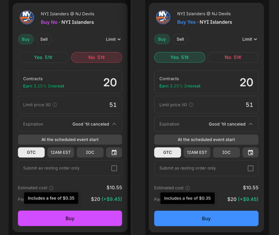 举个例子,Islanders vs Devils 的比赛,恰好在博彩平台上是 52.4%/52.4%。在 Kalshi 上,合约交易价是 0.51 美元(51%)。所以你应该去 Kalshi 交易,因为 51% 比博彩平台的 52.4% 赔率更好,对吧?